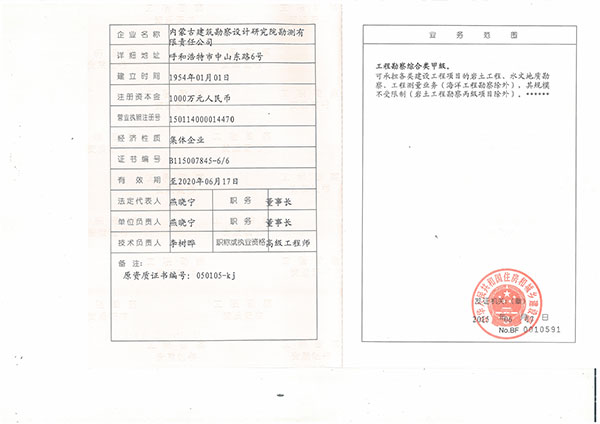 - 內(nèi)蒙古建筑勘察設(shè)計研究院勘測有限責(zé)任公司,是全國首家完成 轉(zhuǎn)企建制的省級建筑勘察設(shè)計單位。公司前身為內(nèi)蒙古建筑勘察 設(shè)計研究院勘測分院, 成立于1954年 ,經(jīng)過六十多年的發(fā)展, 現(xiàn)已成為全區(qū)技術(shù)力量雄厚、專業(yè)設(shè)置齊全的集巖土工程勘察 、 設(shè)計、治理、檢測、監(jiān)理、咨詢、水文地質(zhì)勘查、工程測量、科 研為一體的綜合性企業(yè) ... ... [查看詳情]